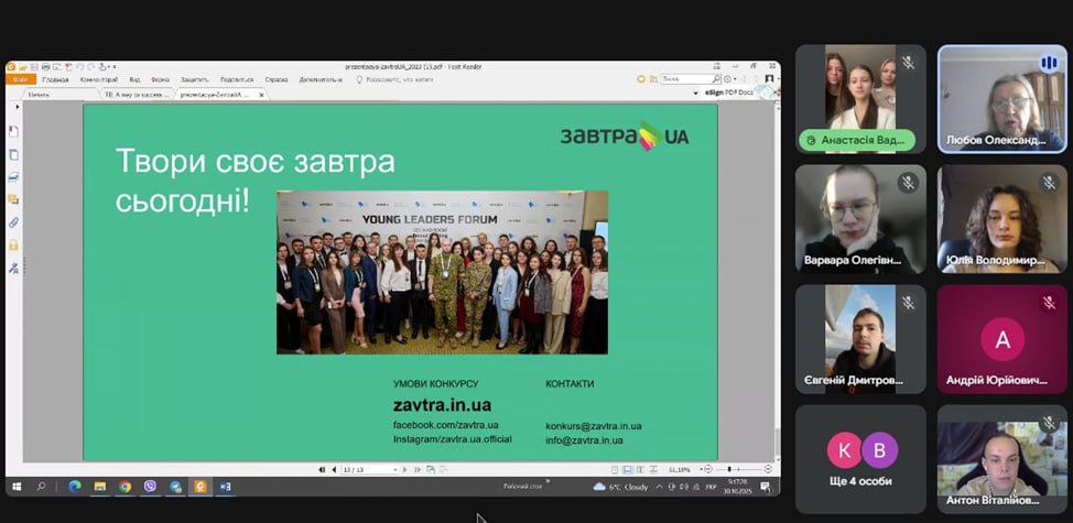 Говорячи про можливості та перспективи, керівник гуртка розповіла про стипендіальну програму «Завтра.UA», яка існує вже біля 20 років саме для студентів, які цікавляться і займаються наукою. Програма щойно стартувала, оголосивши прийом заявок на участь в 2025 р. Студенти ознайомились з умовами та вимогами, переліком необхідних документів та термінами їх надання. Окрім стипендії переможцям, яка виплачується щомісяця протягом року, програма дає ще низку можливостей, як, наприклад, участь у форумах, таборах, контакти з потенційними роботодавцями, стажування, тренінги, розширення соціальних зв’язків тощо. Реалізується багато проектів під лозунгом «Твори своє завтра сьогодні».