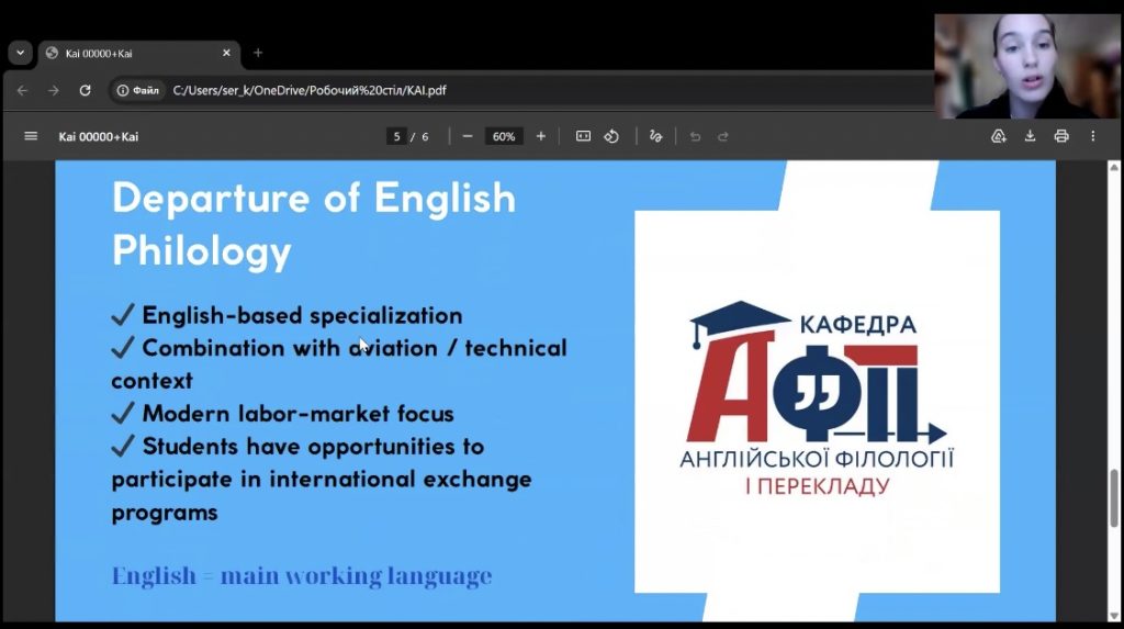 Проєкт стартував 18 березня з установчої зустрічі, під час якої студентки ІІІ курсу спеціальності «Філологія» КАІ – Катерина Тупота та Ксенія Ткачук Ксенія гідно представили університет та освітню програму міжнародній спільноті. Водночас всі студенти спеціальності Філологія КАІ продемонстрували високий рівень володіння англійською мовою та готовність до міжкультурного діалогу.