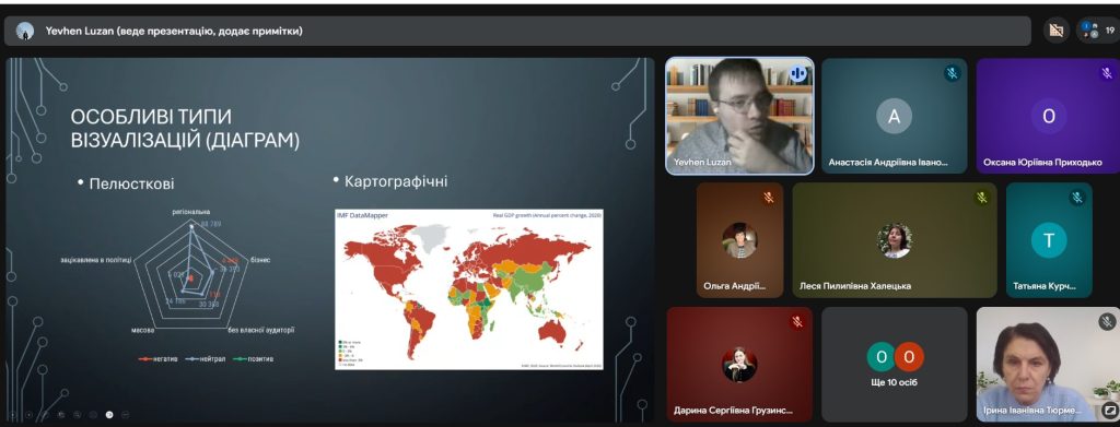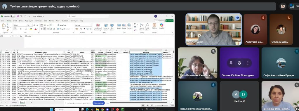 28 березня лютого 2026 р. на запрошення д. іст. наук., професора, професора Ірини ТЮРМЕНКО на зустріч із викладачами кафедри української мови, історії та інформаційної діяльності Гуманітарно-мистецького факультету КАІ та студентами ОПП «Документознавство та інформаційна діяльність» спеціальності В13 «Бібліотечна, інформаційна та архівна справа» завітав Євген ЛУЗАН – провідний аналітик Центру контент-аналізу та Громадської організації «CAT-UA». Є. Лузан виголосив лекцію на тему: «DATA-DRIVEN ANALYSIS У РОБОТІ З КОНТЕНТОМ МЕДІА ТА СОЦІАЛЬНИХ МЕРЕЖ». В лекції Євген Лузан наголосив на ролі математики в аналітичних дослідженнях, розкрив різновиди пошуку, висвітлив правила використання основних логічних операторів пошуку інформації та типи її візуалізації, у тому числі за допомогою ексель-таблиць та штучного інтелекту. Лекція мала теоретико-прикладний характер з акцентом на виконання практичних завдань. Вона викликала зацікавленість та жваву дискусію. В лекції були представлені інструменти пошуку та обробки великих масивів даних, що дозволило зазирнути у світ аналітики.