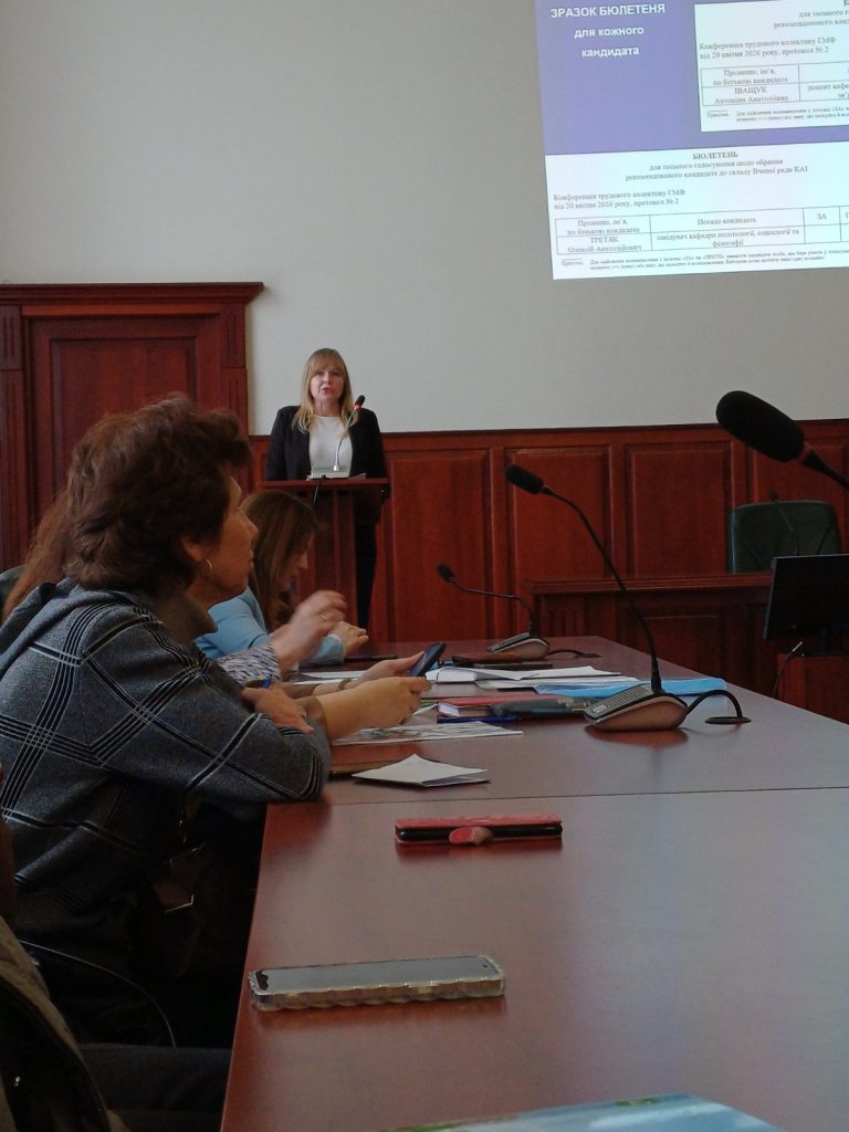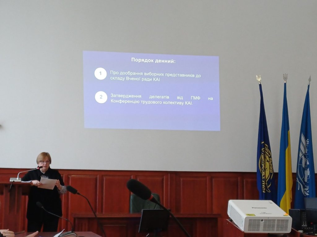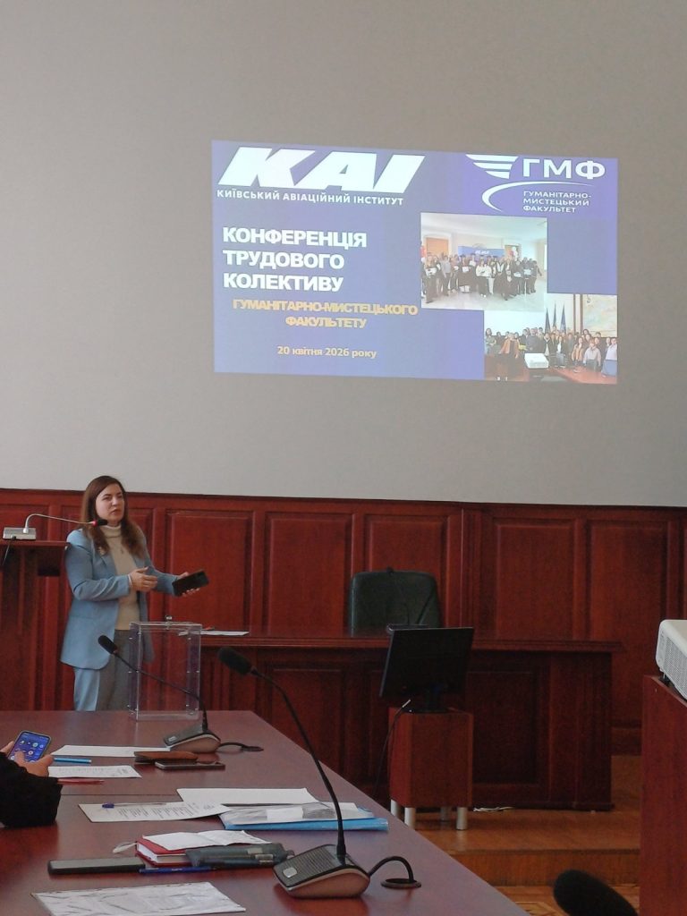 Конференція трудового колективу Гуманітарно-мистецького факультету (ГМФ) відбулася 20 квітня 2026 року. Делегати від усіх кафедр факультету, представники профспілки та члени студентського самоврядування були присутні на конференції. В.о. декана ГМФ Наталія Мельник відкрила роботу конференції, запросивши голову профспілки працівників ГМФ Тетяну Курченко вести засідання, яка підтвердила наявність кворуму: до роботи долучилися 49 делегатів. На порядку денному було 2 основних питання: про дообрання виборних представників до складу Вченої ради КАІ та затвердження делегатів від ГМФ на Конференцію трудового колективу КАІ. Учений секретар Гуманітарно-мистецького факультету Леся Конопляник роз’яснила правила голосування. Було обрано незалежну лічильну комісію, яка оголосила результати таємного голосування, згідно з яким переважною більшістю було дообрано 2 представників ГМФ до складу Вченої ради КАІ. Шляхом відкритого голосування було одноголосно обрано 18 делегатів на Конференцію трудового колективу КАІ. Бажаємо оновленому складу представників ГМФ у складі Вченої ради КАІ та делегатам на Конференцію трудового колективу КАІ мудрих рішень та єдності у досягненні спільних цілей!