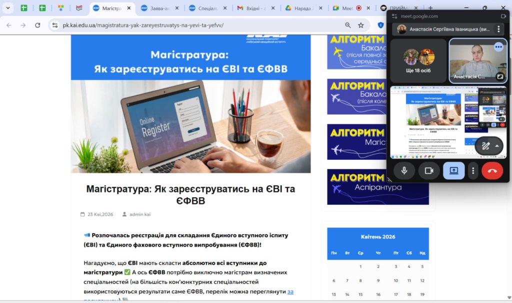 23 квітня о 17:30 та 24 квітня о 13:30 викладачка кафедри англійської філології і перекладу, відповідальний секретар приймальної комісії Гуманітарно-мистецького факультету КАІ Іваницька Анастасія Сергіївна провела дві зустрічі для випускників бакалаврату ГМФ. Під час заходів розглядалися ключові питання реєстрації на Читати далі