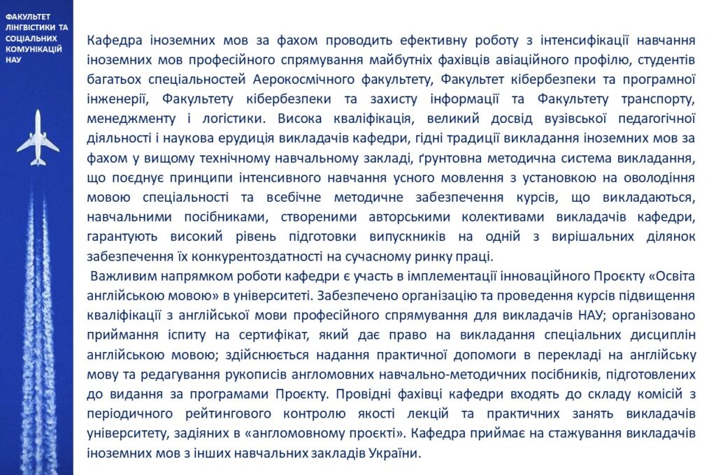 Кафедра іноземних мов за фахом Кадровий склад ПАЗЮРАНаталія Валентинівнав.о. завідувача кафедри, доктор педагогічних наук, професор АКМАЛДІНОВАОлександра Миколаївнапрофесор кафедри, кандидат філологічних наук, професор ГУРСЬКА Олена Олександрівнакандидат педагогічних наук, доцент ТЕРЕМІНКО Лариса Григорівнакандидат педагогічних наук, доцент СТЕЖКО Юрій Григоровичкандидат педагогічних наук, доцент БІЛОУС Наталя Петрівнакандидат педагогічних наук, доцент ДЕНИСЕНКО Наталія Григорівнастарший викладач, вчений секретар кафедри БУДКО Людмила Василівнастарший викладач КОЗЕЛЕЦЬКА Ірина Степанівнастарший викладач АНПІЛОГОВА Тетяна Володимирівнастарший викладач МАКСИМОВИЧ Галина Олександрівнастарший викладач ШУЛЬГА Тетяна Валеріївнастарший викладач СОРОКУН Ганна Василівнастарший викладач ЯЩУК Олеся Петрівнастарший викладач МАЗУРЕНКО Зоя Юріївнастарший викладач БАЛАНЕНКО Наталія Іванівнастарший викладач ДИШЛЕВА Ганна Володимирівнавикладач ЛАРІОНОВА Анастасія Олександрівнапровідний фахівець ЛОДЧЕНКО Юлія Олександрівнапровідний фахівець Контактна інформація: Кафедра розташована у корпусі № 8а, на 13 поверсі.Завідувачка кафедри – 8а.1307; тел. 406-71-45, 408-28-81Вчений секретар кафедри – 8а.1308, тел. 406-71-07Викладацька – 8а.1305Лаборантська – 8а.1304, тел. 406-72-42, 408-28-81